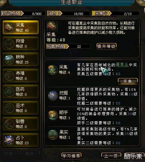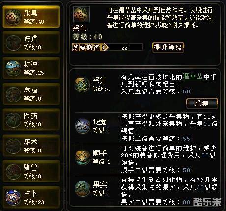 生活技能第一个,采集的东西就是灌草丛,获得的东西根据采集的等级而改变。一次采集花费3点活力和1点采集令(采集令需要通过当前境界的杀劫才可以获得,每次获得1个)