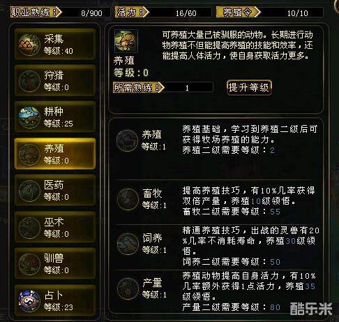 养殖是产出一些物品,主要用途在驯兽和制药上。花费是3活力和1点养殖令。