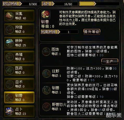 主要是生产图饰,分为增加气血、速度、强法和攻击四大类。