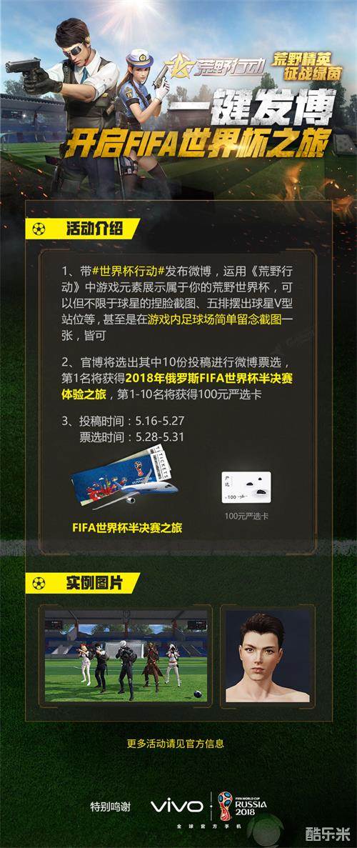 从5月16日至5月27日,带#世界杯行动#话题发布微博,运用《荒野行动》中的游戏元素展示出属于你的荒野FIFA世界杯!微博内容可以但不限定于球星的捏脸截图,或是五排摆出球星V形站位等方式,甚至可以是游戏内足球场简单留念截图一张皆可。