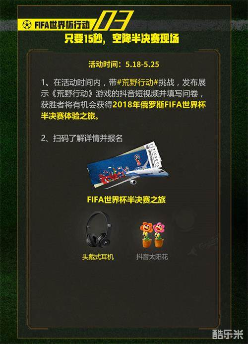 点燃全球激情的俄罗斯FIFA世界杯即将在这个夏天盛大开幕,为了迎接这场全球狂欢,《荒野行动》开启FIFA世界杯行动带你征战绿茵场!从5月16日开始,《荒野行动》推出五大活动,覆盖微信、微博、抖音等各大平台。只要参与活动,即有机会赢取2018年俄罗斯FIFA世界杯半决赛体验之旅,亲赴赛场近距离体验这场顶级足球盛宴!
