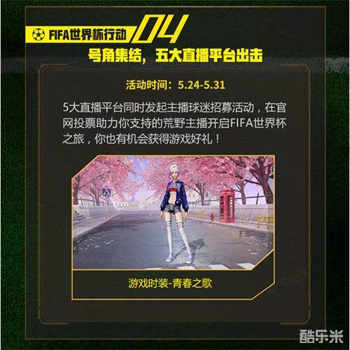 从5月24日至5月31日,熊猫直播,触手TV,网易CC直播,全民直播,龙珠直播五大直播平台将同时发起主播球迷的招募活动,前往《荒野行动》官网投票助力你所支持的荒野主播开启FIFA世界杯之旅,便有机会获得游戏时装“青春之歌”。