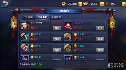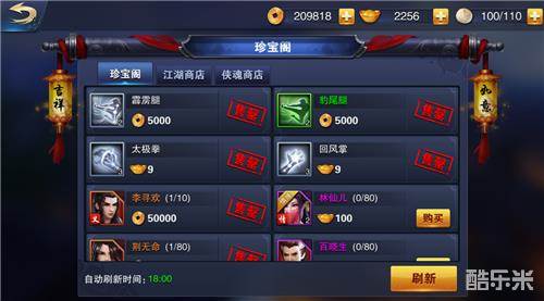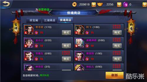 珍宝阁中的商品每个只能购买一次~这也比较符合市场规则~注意,若是你玩家想买某一个侠客的碎片,前提是你得有这个侠客~所以收集越多的侠客对于来逛商店的玩家更有利哦。另外,商店有固定的刷新时间,切莫错过额外的剁手机会呦。