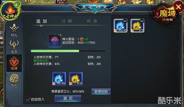 神火的威力不言而喻,玩家想要获得强力的神火就需要组队进入“神火古域”,击败强大的上古BOSS,方能获取神火。不过神火在获取的同时将处于封印状态,需在解封后才能显示出其神秘的力量——神火在解封时有几率获得超凡效果和追加星级,使玩家穿戴神火时将获得额外的属性加成,且超凡属性分为五个效果等级,超凡属性的等级越高,它所提供的效果提升越强。例如战士的超凡属性“连斩”,可以提升战士神技“飞天连斩”的伤害,让你焕发出战神风采。每个职业都将拥有特定的超凡属性,这场运气与实力并存的战斗,让平民玩家也能快速增战,实乃所有玩家之幸事!