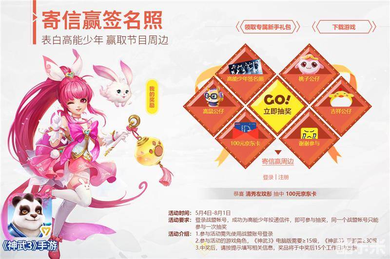 即日起至8月1日,登录战盟帐号,成功为高能少年投递信件,还能参与幸运大抽奖,《高能少年团》同款周边、100元京东卡、高能少年签名照缤纷好礼等你来拿!《神武3》“暖心信箱”为你搭建粉丝、偶像互动沟通桥梁,与王俊凯、张一山等高能少年亲密接触的好机会,千万不要错过哦!