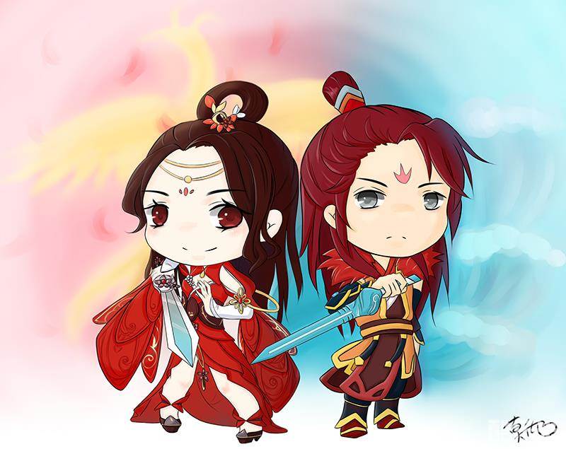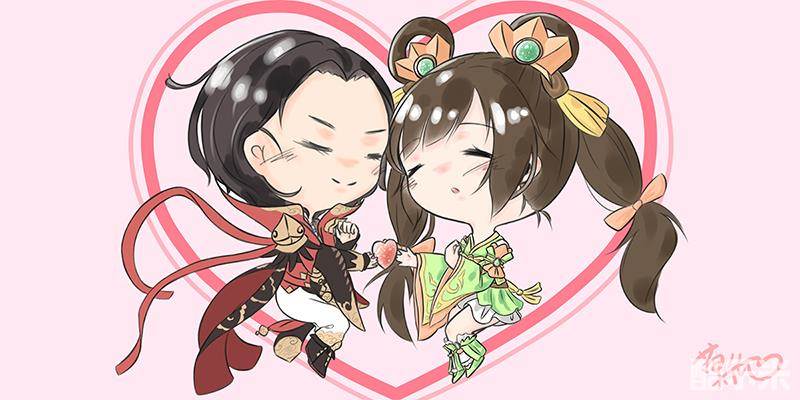比如下面这张周瑜&小乔,在充分将两个人物进行可爱风描绘的基础上,通过对面部表情以及背景的雕琢,洋溢出浓浓的幸福感。对比游戏中一身海岛风装束的帅气周瑜和音乐才女设定的活泼小乔,画中的两个角色完全萌化。