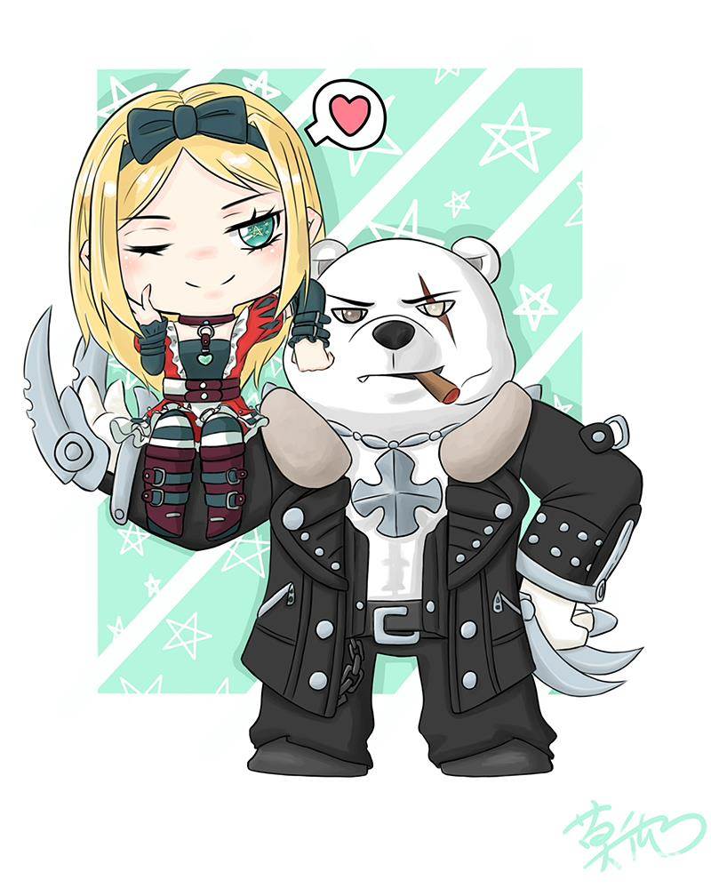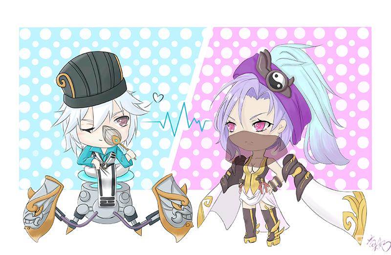 接下来是来自南蛮的祝融&孟获夫妇。大概是这对CP的蛮族风格皮肤实在不讨喜吧,莫彻在这张作品中分别选用了祝融的“梦游仙境”皮肤和孟获的“黑帮大佬”皮肤。孟获皮肤的白熊造型本来就很有萌点,搭上祝融的“梦游仙境”倒是颇有黑童话风格。被画手切换画风之后,两个人的可爱气息呼之欲出,祝融坐在孟获手臂上的整体造型更是十分有爱。