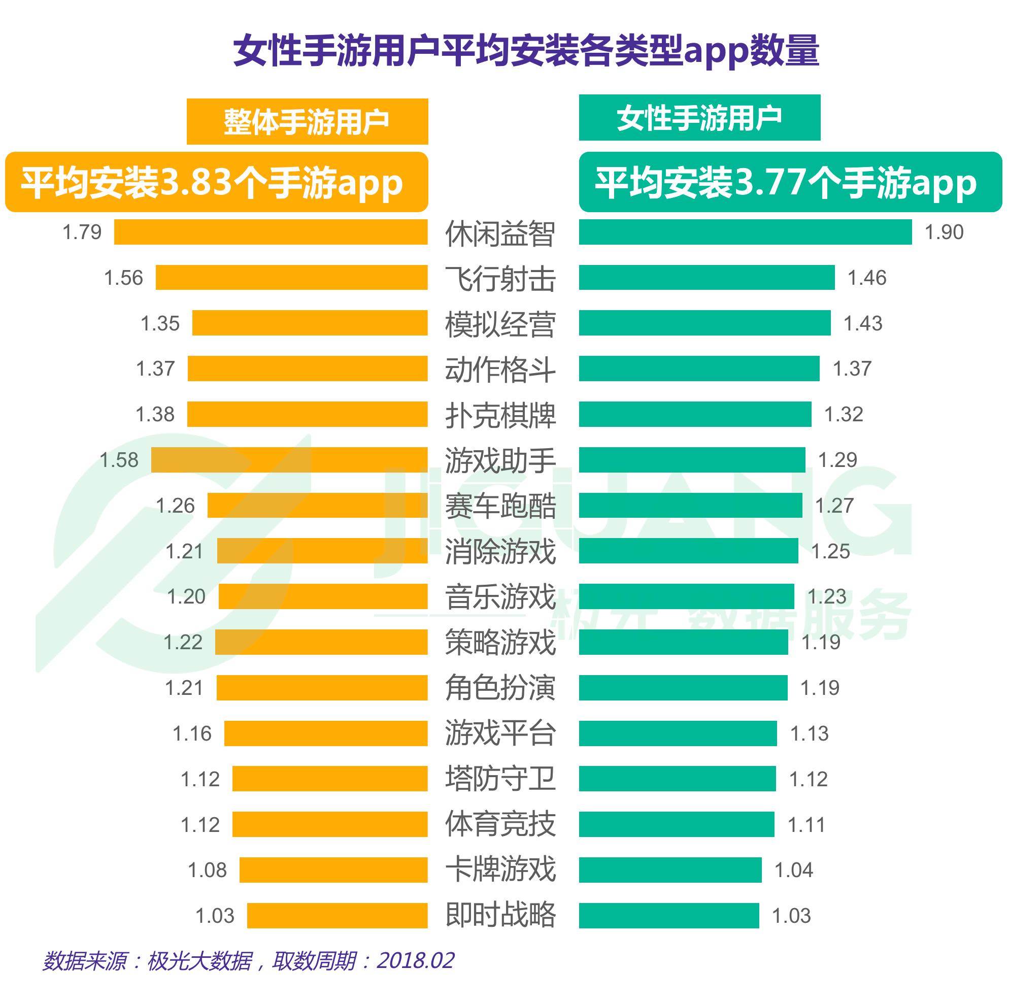 极光大数据显示, 每名女性手游用户平均安装手游类app 3.77个,略低于整体手游用户水平。