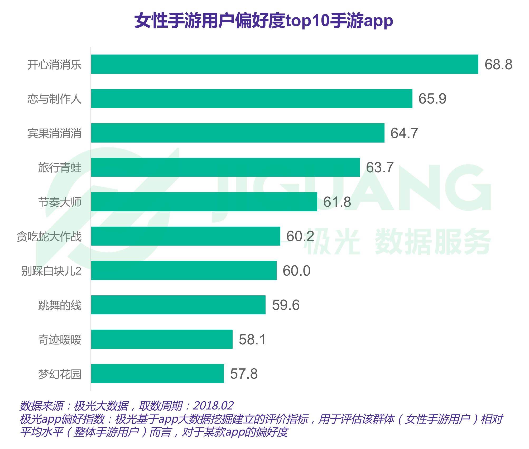 截至2018年2月最后一周,相对整体手游用户,女性手游用户最为偏好的手游app为开心消消乐,其次为恋与制作人和宾果消消消,旅行青蛙以63.7偏好度居于第四位。