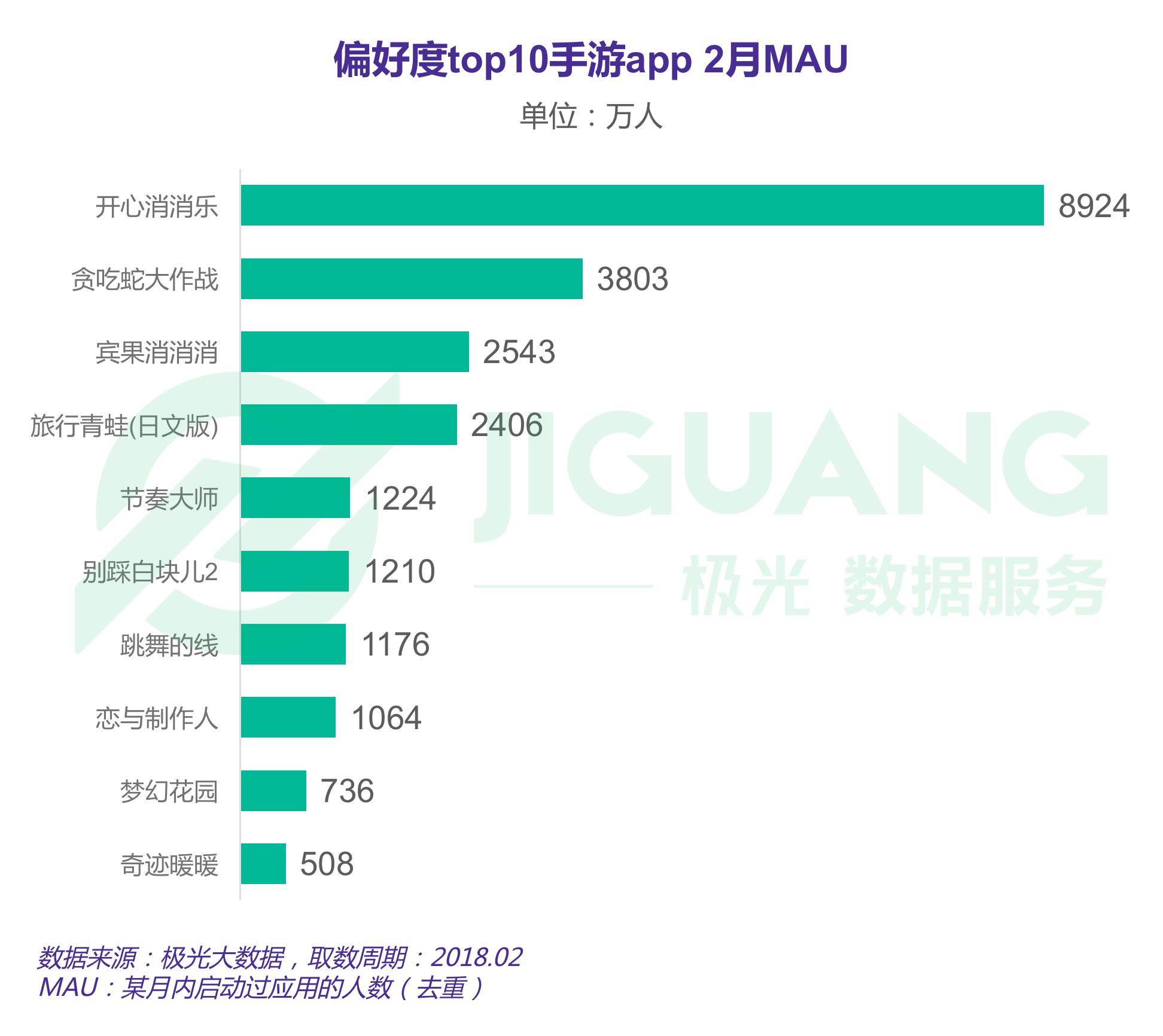 根据极光大数据统计,2018年2月,开心消消乐MAU为8924万,贪吃蛇大作战为3803万,宾果消消消为2543万。