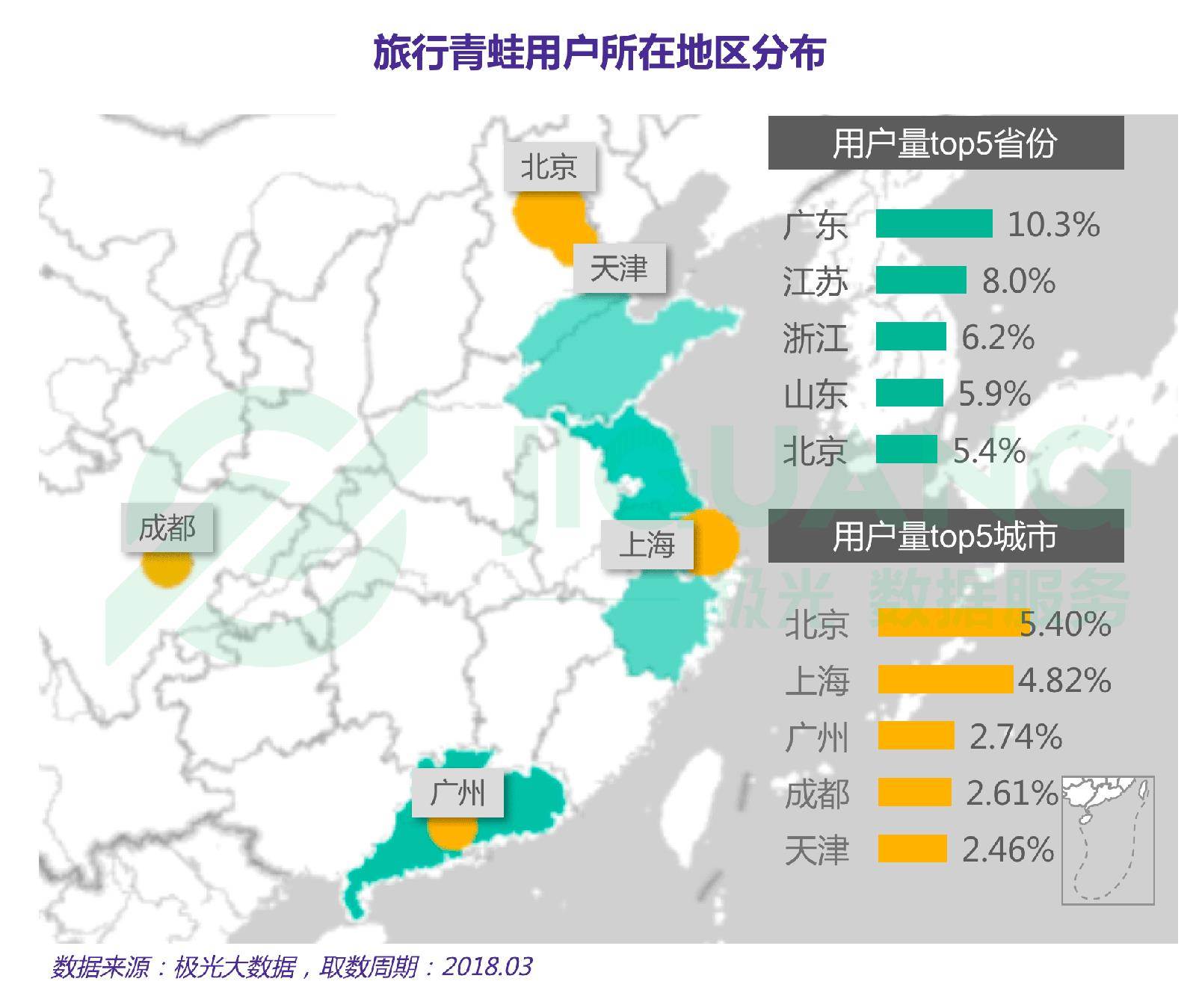 根据极光大数据显示,旅行青蛙用户中38.6%来自一线或新一线城市。根据极光大数据统计,北京、上海和广州为旅行青蛙用户占比top3城市,广东则是旅行青蛙用户最集中的省份,其用户占比为10.3%。
