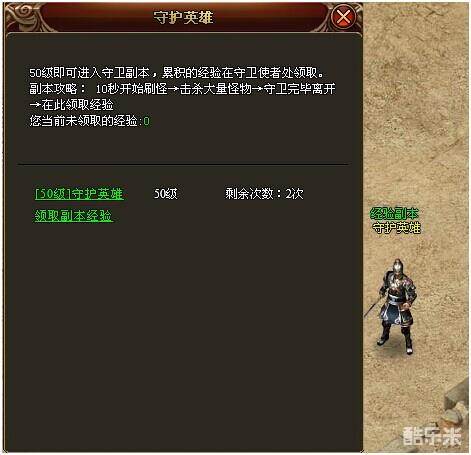 角色等级达到50级以后,可在土城NPC-经验副本(守护英雄)处进入副本