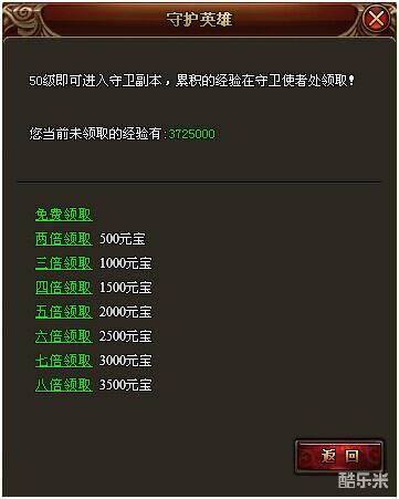 副本结束后可在副本入口NPC处领取副本经验,可花费元宝多倍领取副本经验