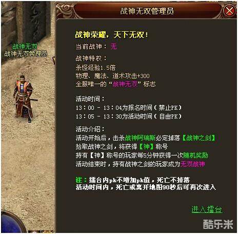 战神无双活动每天14点开启!可从土城NPC“战神4399无双管理员”处进入,14:05后将正式开始进行PK,开始PK前均为和平模式,无法攻击其余玩家,14:05后所有场景内玩家PK模式强制为全体,活动开始后,场景内会刷新出战神阿瑞斯,击杀阿瑞斯后拾取战神掉落的战神之剑,将获得【神】称号,获得【神】称号的玩家每5分钟获得一次随机奖励,活动结束时,持有战神之剑的玩家成为无双战神,可获得三属性攻击+300加成及杀怪经验1.5倍