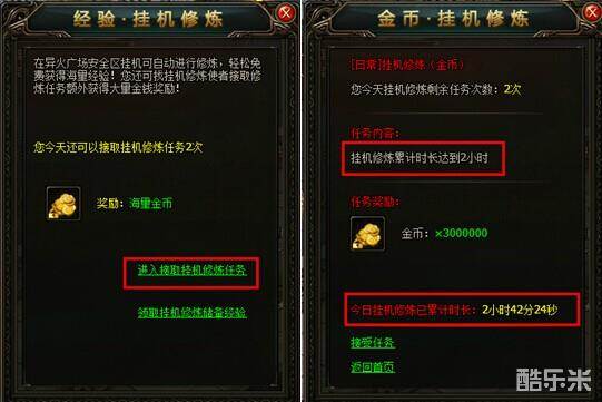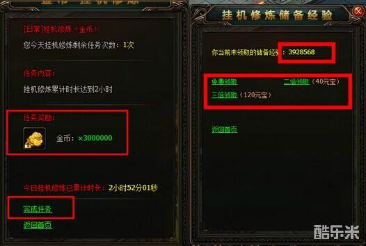 挂机修炼经验可以到挂机修炼NPC储备处领取分别是免费领取当前挂机的经验、花费元宝2倍领取、花费元宝3倍领取,经验越多需求元宝越多。