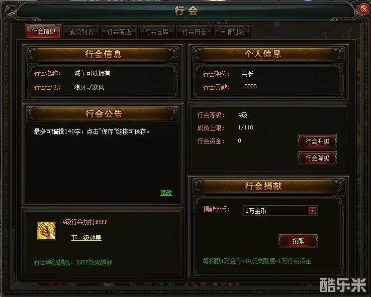 4、 行会捐献:行会捐献消耗不绑定金币,捐献档次分为1W金币,2W金币,5W金币,10W金币,20W金币,50W金币,100W金币,1000W金币。每捐献1W不绑定金币玩家将获得10点贡献度,同时行会将获得1W行会资金