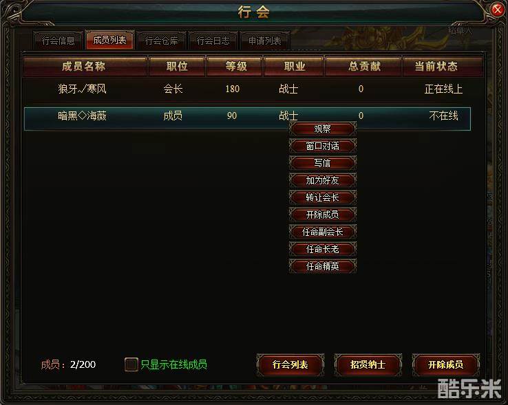 加入行会以后,会长可以对行会成员进行各项操作,能提升成员的职位,也能将其踢出行会