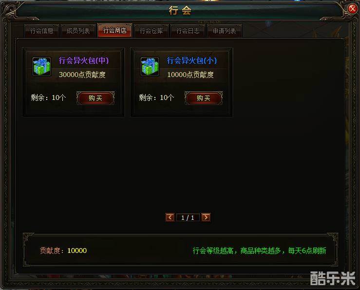 行会成员可以在行会商店内消耗行会贡献度购买商品,行会等级越高,商店出售的种类也就越多,商店将在每天6点进行刷新