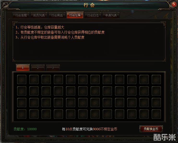 加入行会后玩家可以把带有贡献度的不绑定装备存入行会仓库获得贡献度,同时从行会仓库内取出装备时需要消耗相应的个人贡献度(每10点贡献富可兑换9000不绑定金币),行会等级越高,仓库的熔炼也就越大。