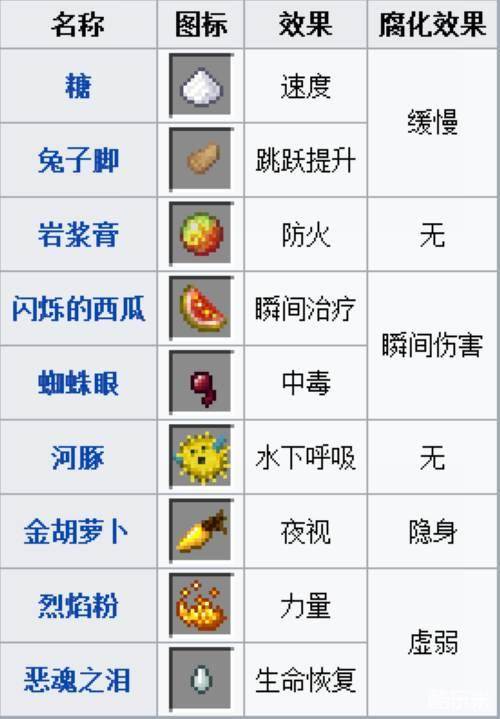 1.基础材料:是所有药水的起点。地狱疣是这个阶段加入水瓶的主要材料,出于它被需要用来制作多数的药水。其他所有的基础材料都只能用来制作"虚弱药水"。