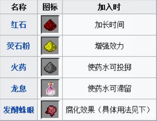 3.改性剂:会改变药水的属性。"时间加长"和"效力增强"的版本可以无限地互换。