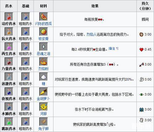 1.基础药水:都是通过在水瓶里加入单个材料制作而来的。平凡的药水和虚弱药水可以和火药结合来创造出对应的喷溅药水。