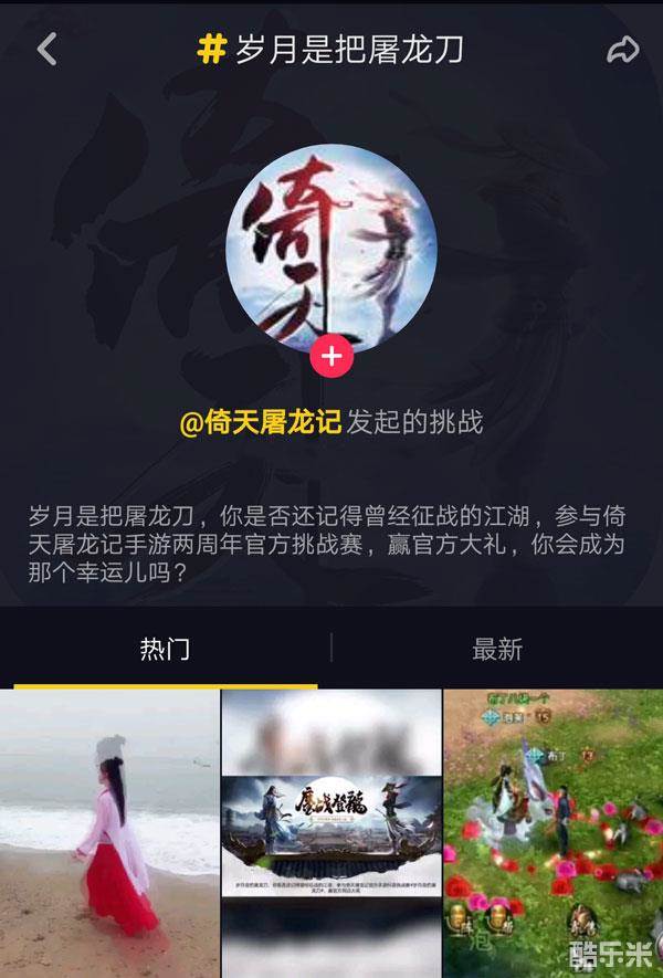 参与《倚天屠龙记》手游两周年官方挑战赛,赢取海量周边大礼!那么问题来了,究竟怎么挑战?很简单!抖音APP搜索“#岁月是把屠龙刀”,点击“参与”按钮上传视频既可参与挑战,就是介么简单!不仅如此,参与挑战的视频要求也非常简单!内容只需贴合音乐歌词“来也匆匆去也匆匆……谁与我生死与共”即可!