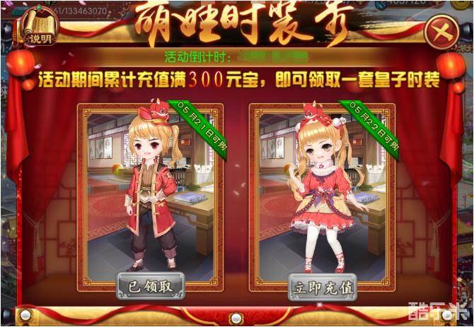 【活动内容】活动期间,玩家累计充值300元宝,即可前往“限时活动”中的“萌娃时装秀”领取奖励!