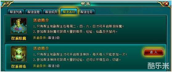 a、帮派神珠开启后,可以在帮派界面的“帮派活动”标签进入帮派领地;