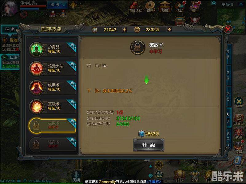 首先,要说明一点,非常重要,79级等级封印开启后,我们到了80级会在氏族技能里发现两个新开放的技能——破敌术、强身术,有些人看到后直接点了升级,其实这两个技能稍微有点不一样,因为它们需要经验升级!!!学一次四千多万经验就没了,建议不要点的太多,先把等级升上去,89级等级封印整整20天,等到等级升满了,再攒经验继续学技能也不迟。