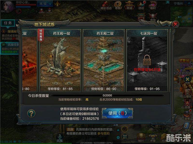 最最最重要的一点,每天的地下城试炼千万不要忘记,要去比自己更高等级的地下城刷怪经验更多,80级之前建议去药王殿一层,80级之后去药王殿二层刷,组队小建议:去法师、战士多的队伍,抢怪、刷怪快很多,基本俩个小时内就完事,若有战士拉怪,时间会更短,基本一小时左右就刷完了,不建议晚上挂机刷怪,那时候人多怪少,刷的很慢。