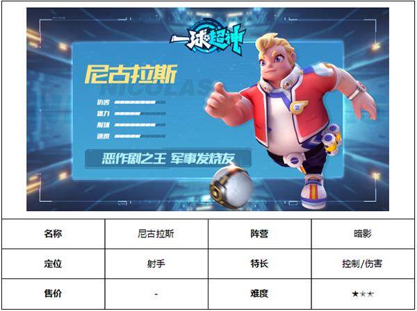 尼古拉斯是一个非常强力的英雄,但大部分的技能都需要精准预判,在操作上有一定的要求,如果尼古拉斯的震撼弹和大招经常无法命中,那他场上起到的作用就非常有限了。虽然尼古拉斯的射门能力很强,但因为他完全没有位移技能,大部分时候都需要通过自己的技能或者通过队友来创造射门时机。