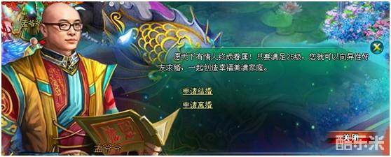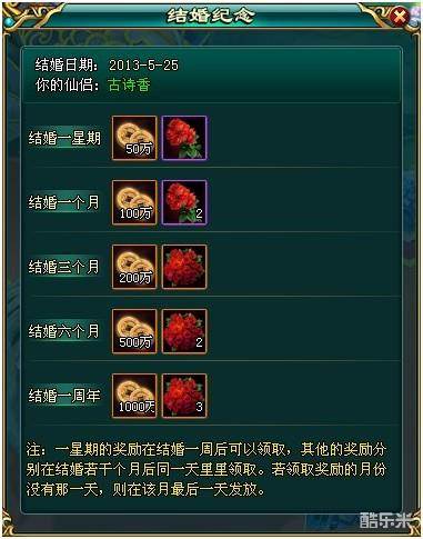 成功结婚并且婚姻持续一定的时间,可以到结婚NPC孟爷爷处领取纪念礼物。