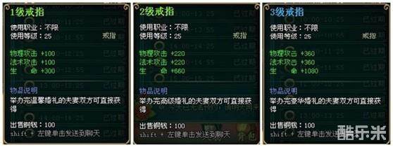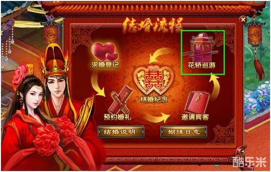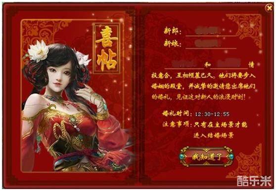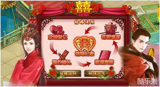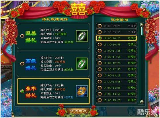 当您的伴侣同意结婚后双方成功订婚,就可以进行预约婚礼;不同婚礼需要消耗不同的铜钱或元宝,获得不同等级的婚戒。