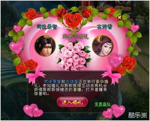 到了预定婚礼时间,游戏上方会出现“浪漫婚礼”图标,收到请帖的玩家可以直接进入婚礼现场,没有收到请帖的玩家可以点右下方“索要喜帖”向新郎新娘索要喜帖。