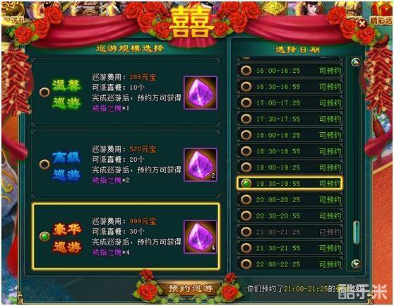 每天早上9点到晚上23点,每半小时有一个时间段可以举行巡游,全天共28个时间。每个服务器,每一个时间段只能预约一场巡游,先约先得。