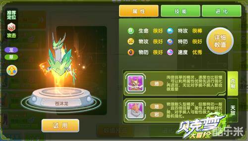 众所周知,龙是中华民族的图腾。在《贝克梦大冒险》手游里,也本土化的添加了许多龙系属性的小精灵。这其中,苍沐龙做为全新加入的龙系贝克梦代表,具有完全形态龙的造型,不得不让人刮目相看。草绿色的皮肤又赋予苍沐龙兼属草系的特色,增加了精灵的辨识度,下面就为大家带来苍沐龙的介绍。