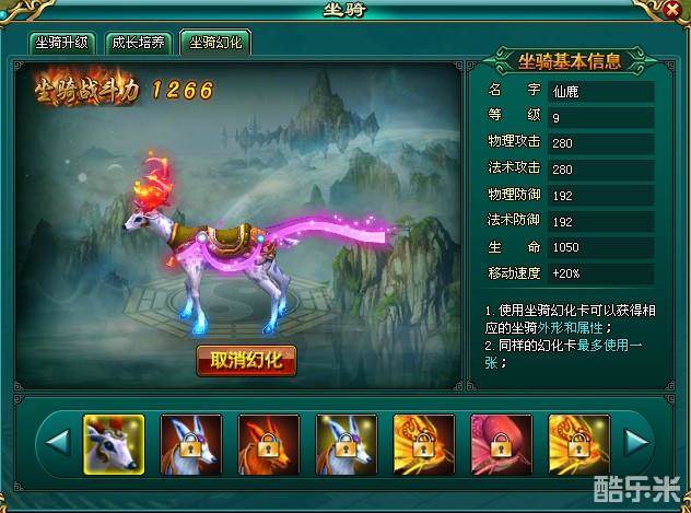 1. 游戏商城出售坐骑幻化卡,玩家使用幻化卡之后,坐骑能够获得幻化卡带有的属性和外形;