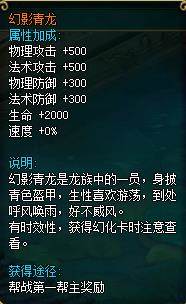4.每周帮派战第一名的帮主可以获得幻影青龙幻化卡一张,使用期限为7天,在下周帮战前幻化卡的效果会消失。