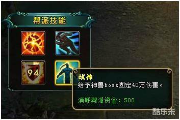 (1)战神:给予神兽boss固定40w伤害,消耗帮派资金500;