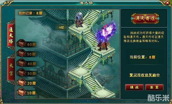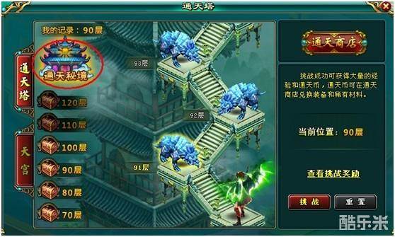 通天塔共200层,每10层一位守护上仙;玩家首次成功挑战各层,会获得丰厚的经验,每十层挑战可以获得大量经验和通天币,通天币可以在通天商店里兑换装备和稀有材料;已成功挑战过的关卡,每日可重置一次,只需扫荡便能获得物品、经验奖励,免去玩家需手动重复性爬塔的麻烦;