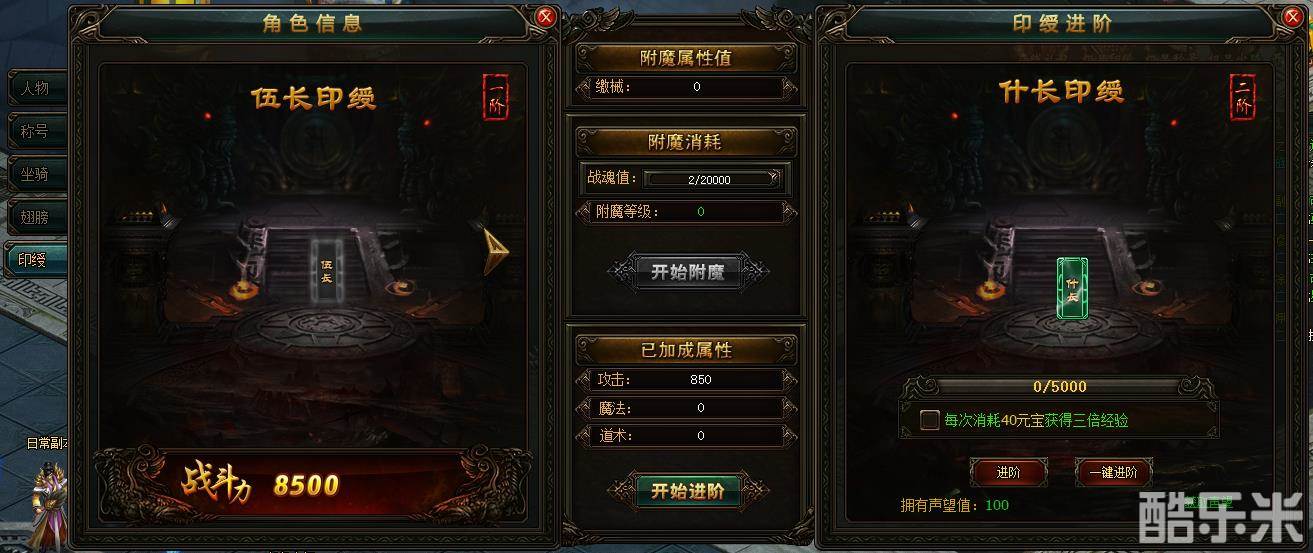 5:印绶升阶将根绝玩家的职业带来攻击、魔法、道术的属性附加。