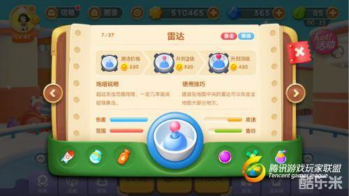 雷达炮塔没有减速和溅射的特性,一般用来拦截血量较厚的BOSS。糖果赛前期的怪物血量薄数量少,雷达炮塔的建造价格又比较昂贵,所以在前期建造雷达炮塔并不是最佳选择。阿波建议大家在前期选择太阳花、负电塔等范围攻击的炮塔,这样在清怪的同时还可以清理场内道具。