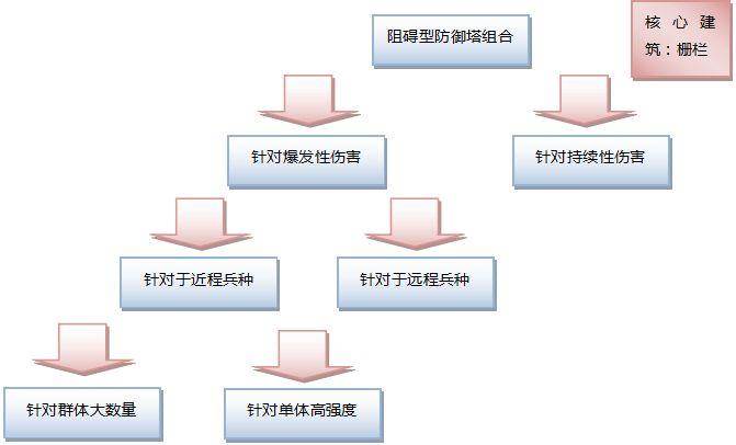 防御建筑组合的设计方向:防御塔组合目前主要有三个设计方向,分别是阻碍型防御塔组合;通行类防御塔组合;混乱性防御塔组合。