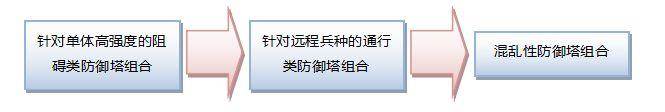 通行类防御塔组合核心是箭塔或魔法塔,允许敌方近程兵种通行,会对远程兵种或血量较少的近程兵种造成打击;混乱类防御塔组合核心是兵营或狮鹫塔,目的为冲散敌方部队的前后联系。