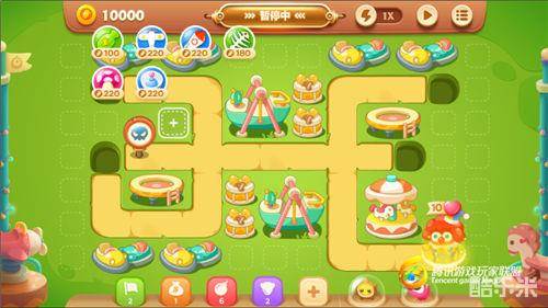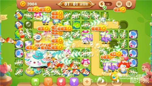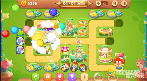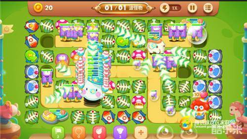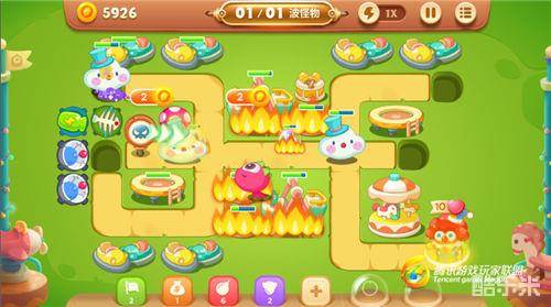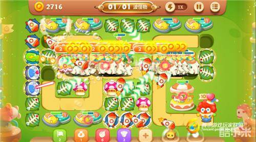 开局后,阿波先在出怪口附近建设2座顶级蘑菇炮塔,用来打劫怪兽们可怜的钱包;建设2座顶级的雷达,用来清理被蘑菇打劫过后的怪群;建瓶子炮和鱼刺各1座,用来补刀漏怪。最后,在最下方建设3座顶级的火箭,能让你在灭怪之余还能轻轻清理目标障碍物哟!