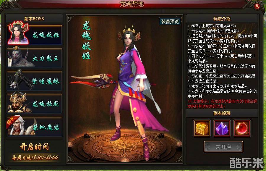 2.龙魂禁地的开启时间为每周日19点30至21点,玩家拥有2次免费挑战的机会,可以花费元宝购买额外的挑战次数;