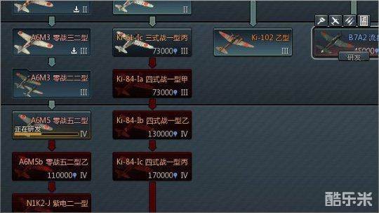 在科技研发树中,红色载具为当前不可研发状态;当可以研发时图标变亮并用蓝色灯泡图标提示研发所需点数。此时点击研发按钮后,改国家每场战斗都会为这架载具积累研发点数,研发完成后会提示可以购买(也可以直接用金鹰解锁,但需要消耗公共研发点数)。每个国家同时只能研发一架载具。