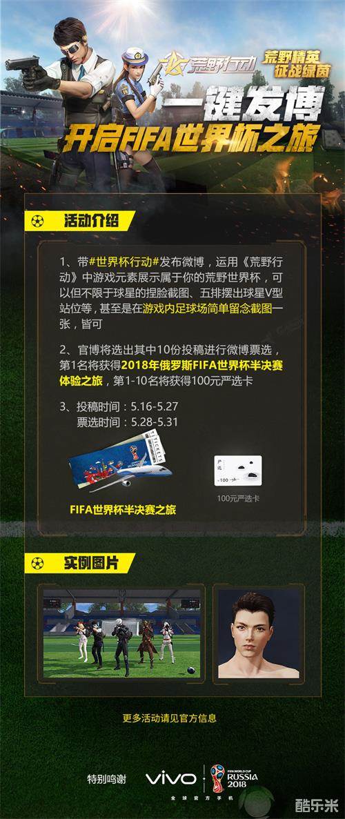 5月16日至5月27日,带上#世界杯行动#话题发布微博,巧妙地运用《荒野行动》中的游戏元素表达出你心目中的荒野世界杯。形式包括但不限定于在捏脸系统中捏出球星的脸并截图、或是五排摆出球星V形站位等方式,甚至可以去游戏内足球场场景简单留念截图一张也可以。