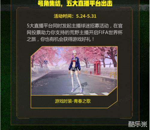 动手投票也能获奖!从5月24日至5月31日,熊猫直播,触手TV,网易CC直播,全民直播,龙珠直播五大直播平台将同时发起主播球迷的招募活动,只要你在此期间前往《荒野行动》官网投票助力你所支持的荒野主播开启FIFA世界杯之旅,便有机会获得游戏时装“青春之歌”。让荒野世界的所有人看到你的风采!